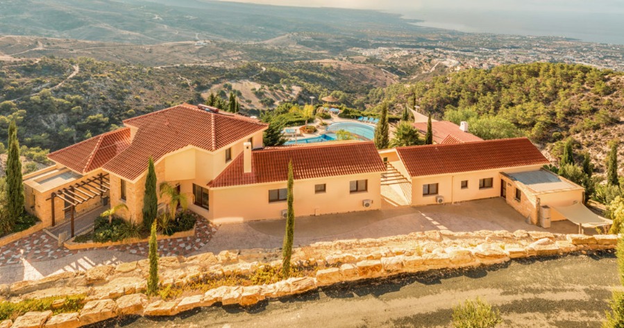 The property, faces down the peaceful but spectacular view of Paphos and the Mediterranean Sea. The palatial main house consists of an open plan living area, with well-equipped dining kitchen, a separate utility room, 6 bedrooms, some of which are en-suite, and a guest shower room. You will find the spacious and comfortable living room with its plush sofas, a 52 inch TV.